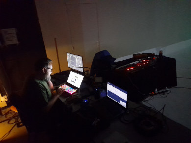De temps en temps j’appelle Maxime. Et je dois m’occuper de tout le reste aussi : l’animation des dessins, la vidéo, tout ce qui fait partie de la participation du public, je cale à chaque fois ce qui va apparaître sur les téléphones portables, ce qui va apparaître sur l’écran, tous les changements que cela implique, parce que ça change tout le temps au fur et à mesure, il faut changer les questions adressées au public, il faut changer l’interface, etc. Il y a plein de choses à changer avec le Live Drawing que je connais maintenant très bien. Et je fais aussi la lumière. Ça fait beaucoup de choses à faire, et c’est moi qui gère la technique, par exemple c’est moi qui gère le son de Yovan quand ça ne marche pas. Enfin lui, il regarde, il fait des choses, mais généralement c’est moi qui vais mettre les mains dedans.