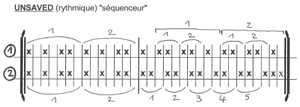Voici de quoi écouter seulement les deux parties de cette rythmique, avec trois réprésentations visuelles différentes. Vous pouvez cliquer sur chaque image pour ouvrir un onglet où elle apparaîtra en grand format (entre 2000 et 3000px de large).